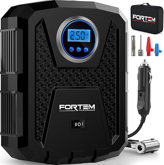 - Portable and Compact - Take your Fortem air compressor for car with you and be ready for any emergency. The 14ft power cable is stored inside the small compact unit making air compressors the perfect accessory for automobiles.